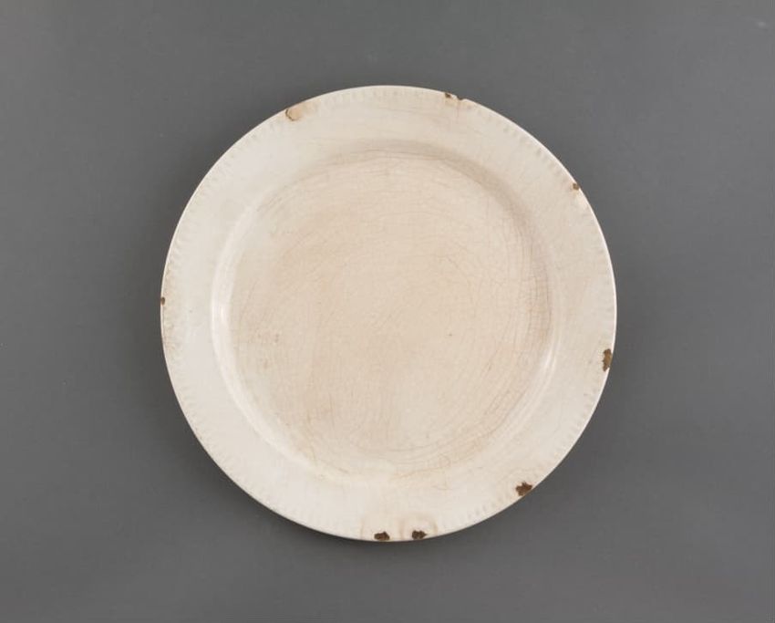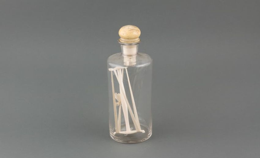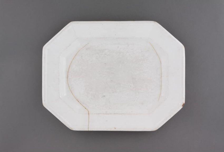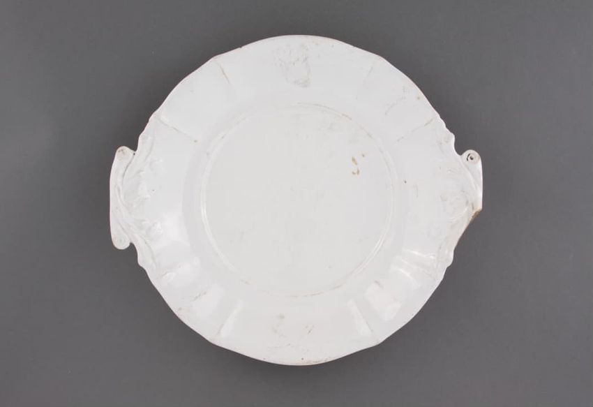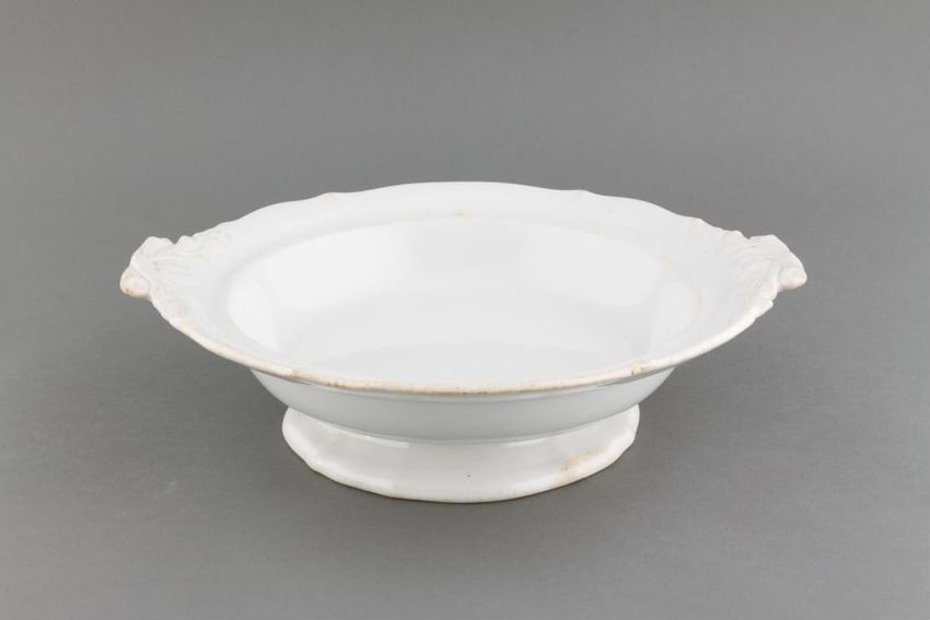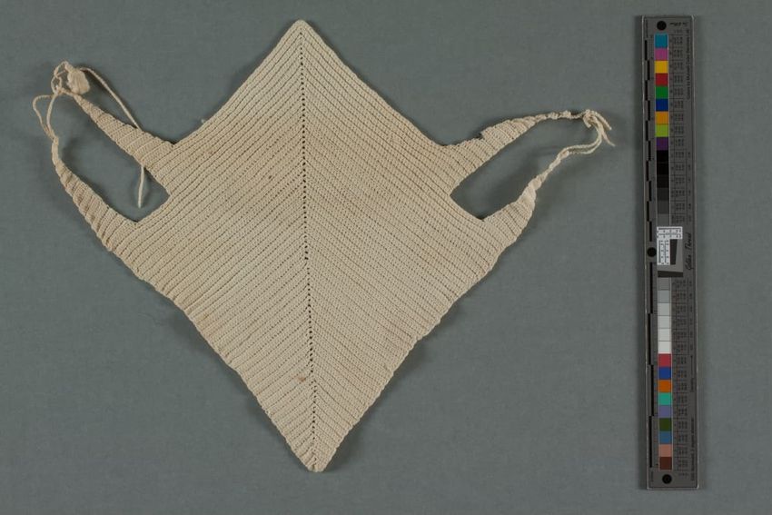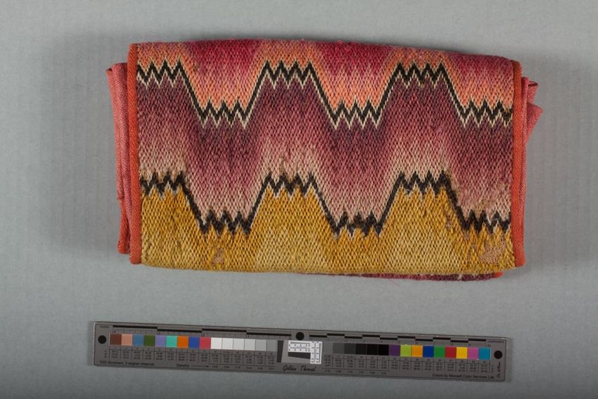 Flamestitch - wide horizontal bands of purples, gold, pink, peach, greens, with black; opens side by side with four pockets; lined with red glazed wool; edged with red twill tape.