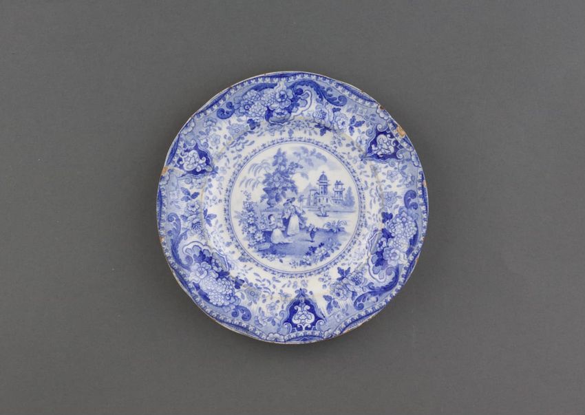 Earthenware plate with blue transfer-printed scene of two women gathering flowers beside, or bringing flowers to, an urn-on-pedestal. Waterway, sailing vessel and tower with dome and cross in the distance. Border pattern of flowers, scrolls, and ribbon.