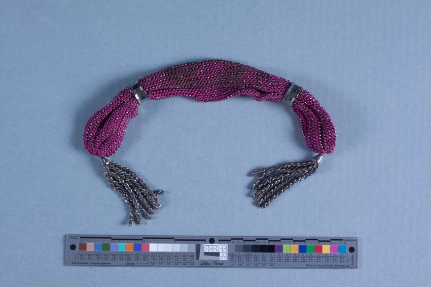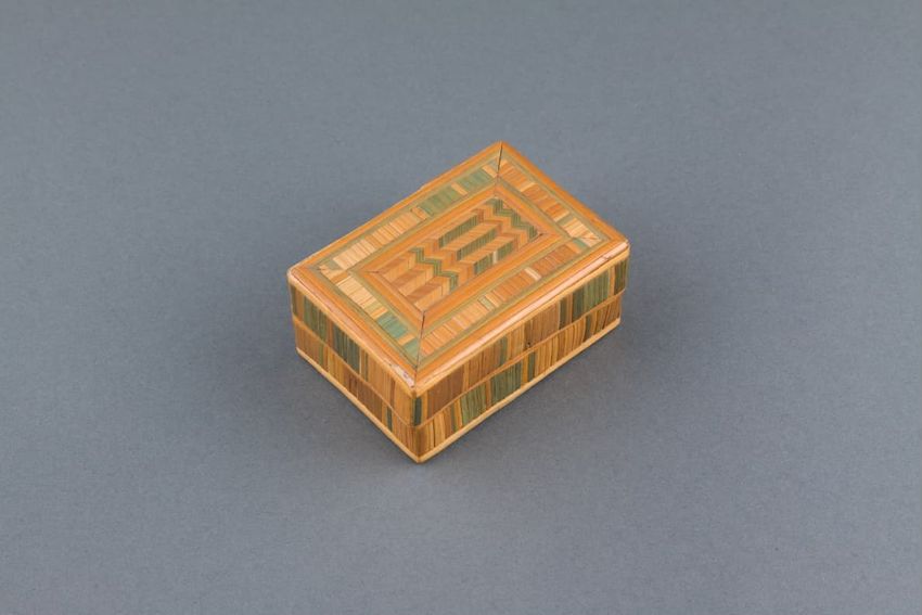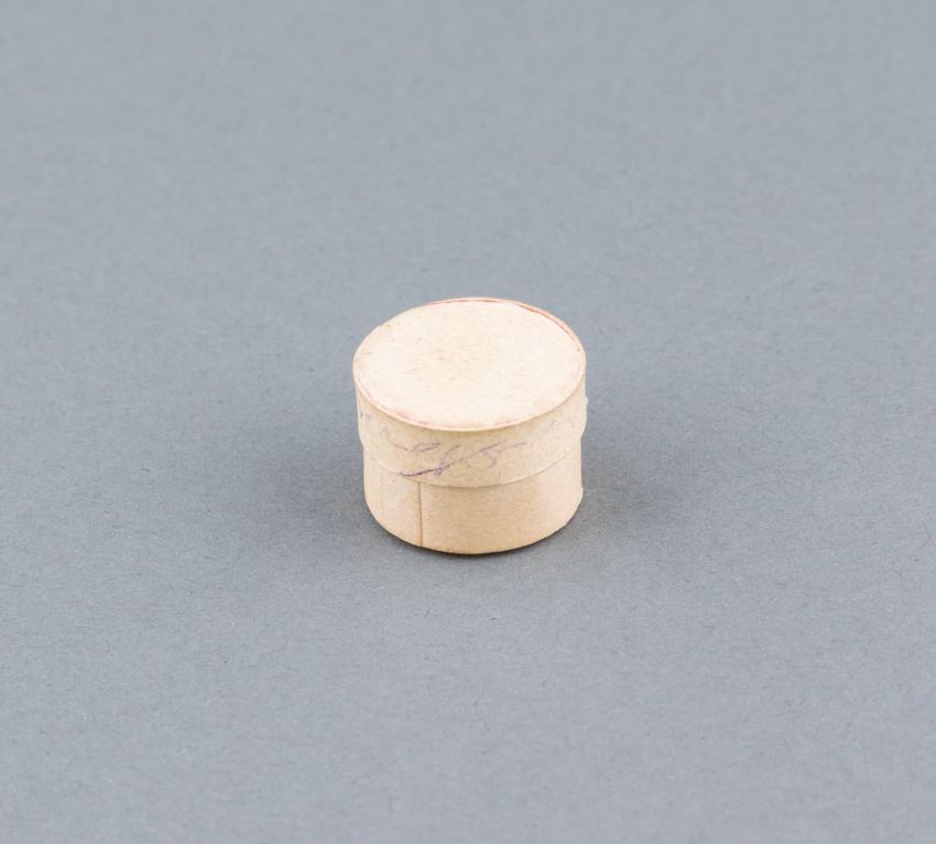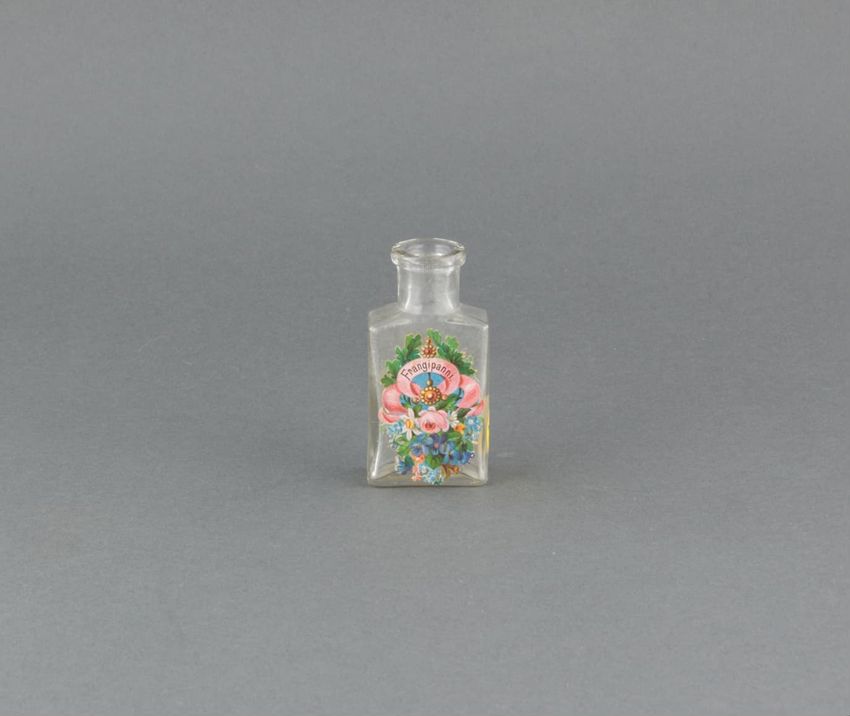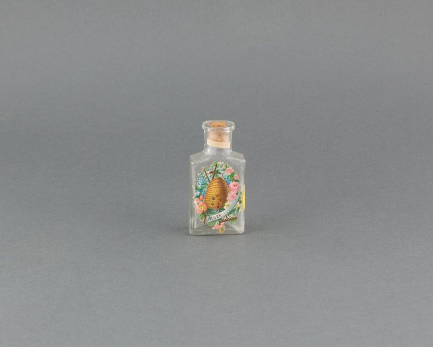 Enameled porcelain mug with twisted cord handle. Two square, scroll-edged medallions on either side of mug. One medallion depicts flowers, bird and butterfly. The other medallion, a scene with two male and two female figures. Opposite the handle, is a round medallion with flower and bird. Surround...