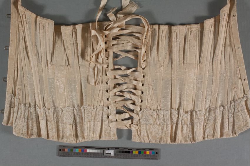 White; waistband has one white glass button; gathered around waist, fullness at back; front has embroidered panel--meander of openwork, leaves, flowers, hearts arranged in pyramid; hem has two bands of same meander of openwork, with checked openwork bands.