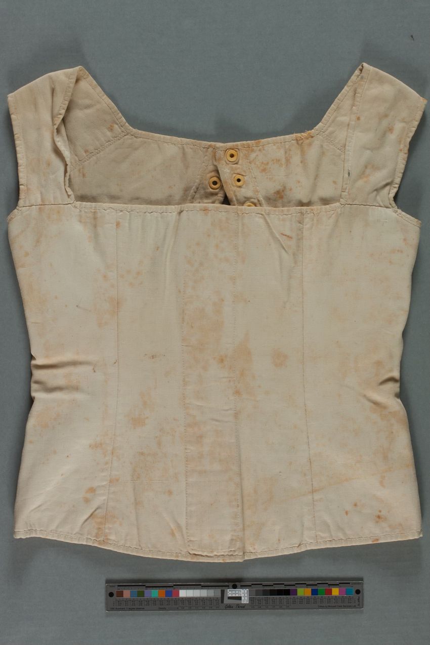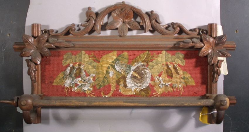 Central panel of sixteen alternating rows of solid black wool blocks on end, and pieced eight-patch black and red "pin-wheels". Tacked at corners and mid-points along sides with blue wool yarn. Border of pieced black and dark wool; rounded corners at foot. Quilted in squares and diagonal lines.