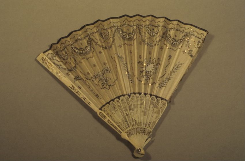 Material: carving (processes), ivory (tooth component), rhinestone, silk (textile), sequins (spangles)