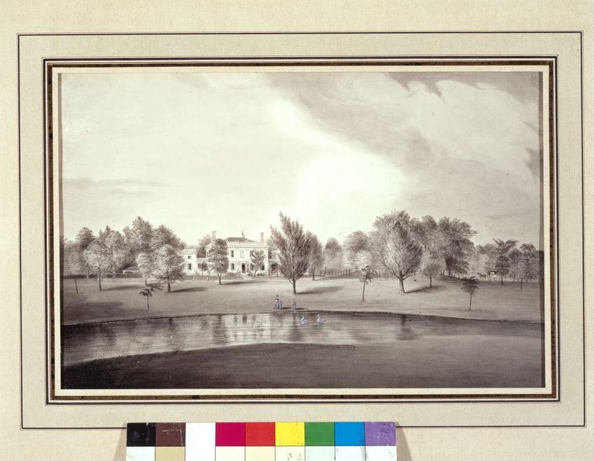 Earthenware wash pitcher with blue transfer-print pattern depicting three figures viewing a classical ruin beside a waterway. One of the figures sits on a fallen column, horned goats graze in the near distance. The interior and exterior rim, foot and handle are printed with floral sprays over a patt...