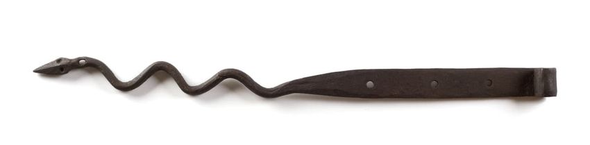 Wrought iron hing; half is flattened and the other half is twisted corkscrew-like with a pointed head.