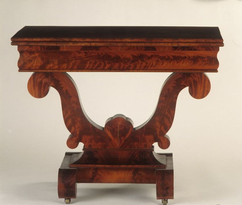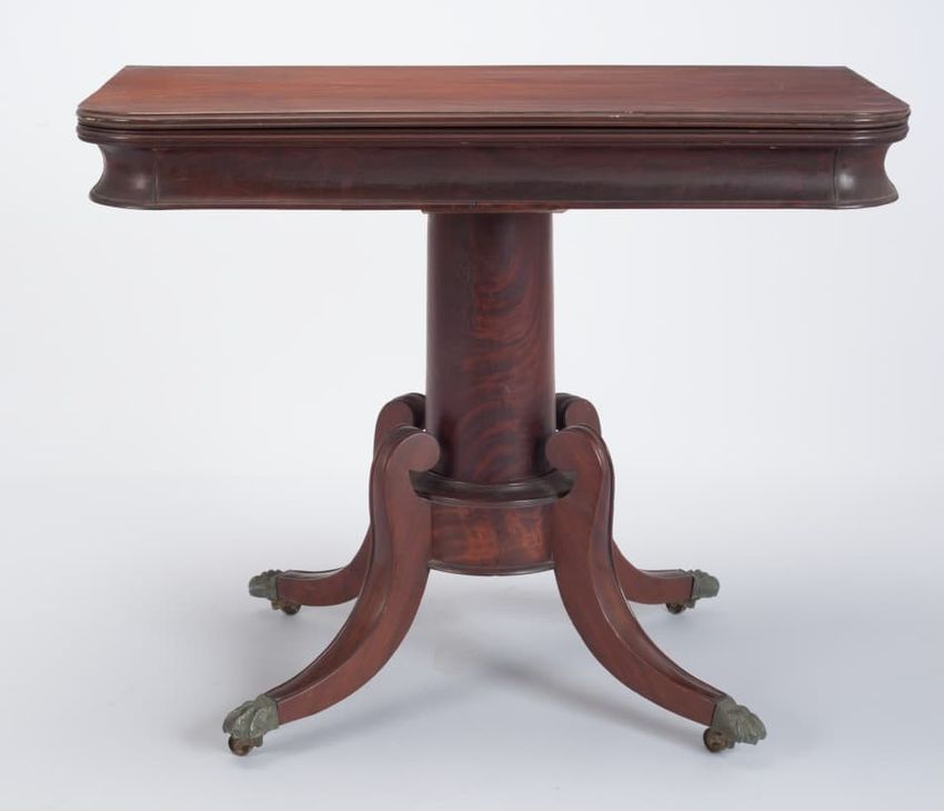 Card table. Mahogany, veneered, chestnut, white pine secondary wood. Molded top c-scroll legs with acanthus leaf carving, molded with foliate carved knees; heavy pillar-turned base; turned acanthus-carved pillar; "paneled" rails.