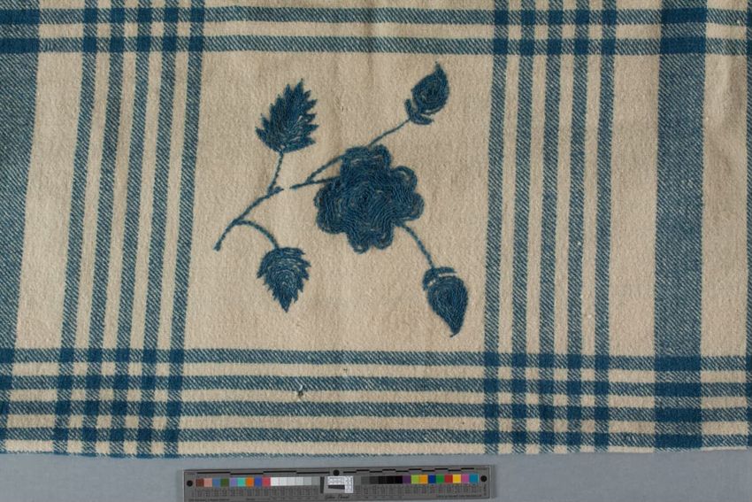 Alphabet/Verse sampler. Large scale geometric/ floral border, vertical rectangle, natural linen ground. Alphabets at top, verse at center, potted flowers below. Alphabets: #1-complete; #2- "A-W", missing "J"; #3-missing "J"; #4-complete; Numbers: "1-13".