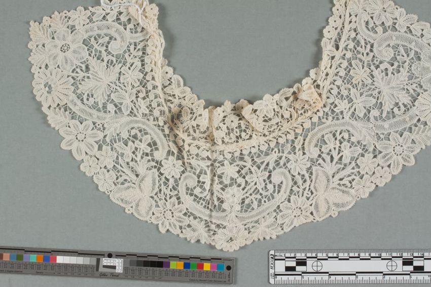 Cream chevron bands (resemble passementerie), with overlay of straw meander; brim has round edges, and extends to form neck band; round crown, with sprial pattern of straw; fully lined with black silk; wire band along brim and neck is covered with cream silk; no trimming or neck ties.