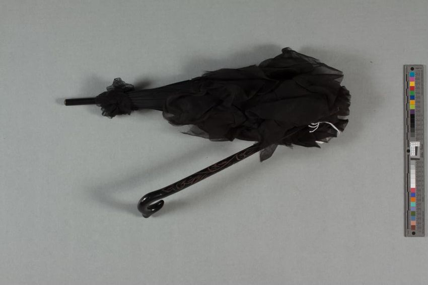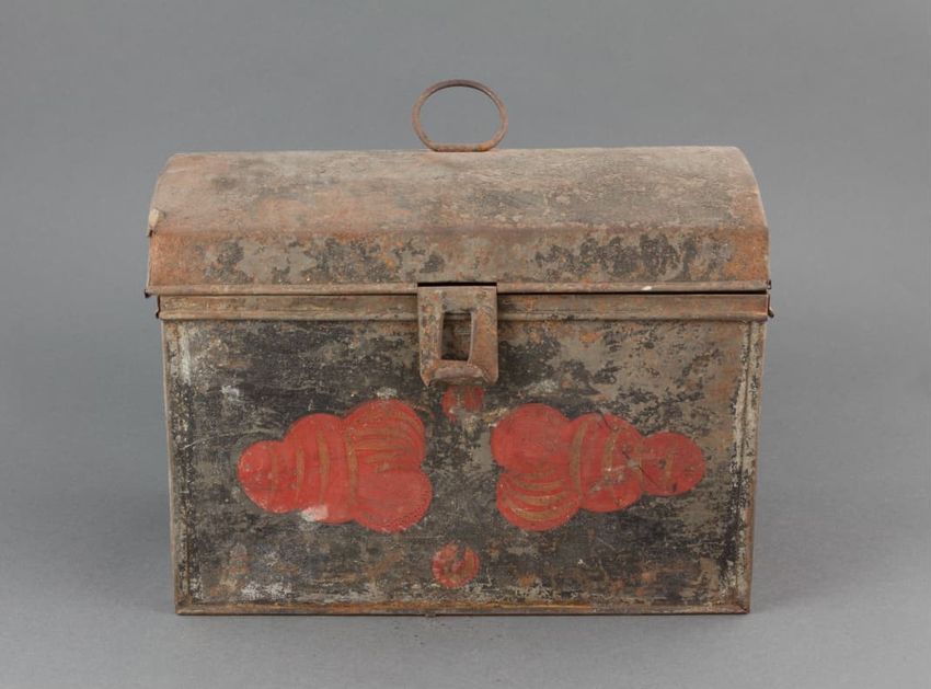 Ironstone handless cup and saucer with mulberry-colored transfer-printed pattern with elements overglazed in blue, green, yellow and red. Border pattern of scrolls and roses. Central scene of urn, vase, and flowers.