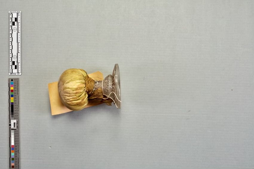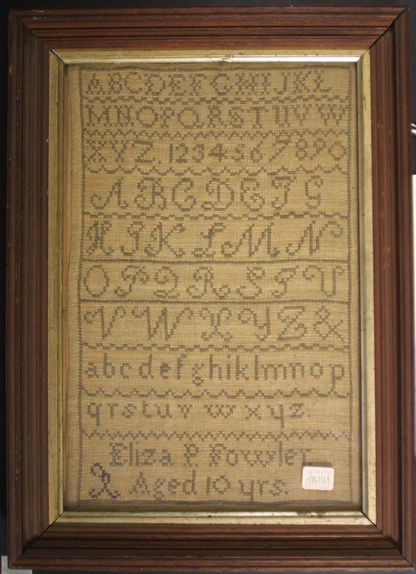 Alphabet Sampler. Vertical rectangle, ivory linen ground. Monochromatic; sage-green thread. Each row of alphabet separated by a line of cross stitching. Alphabets: #1 complete, #2 complete, #3 missing "J"; cross stitch; framed, wood with gilt at center; under glass.