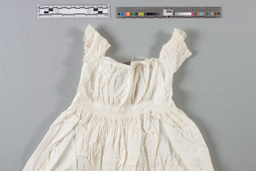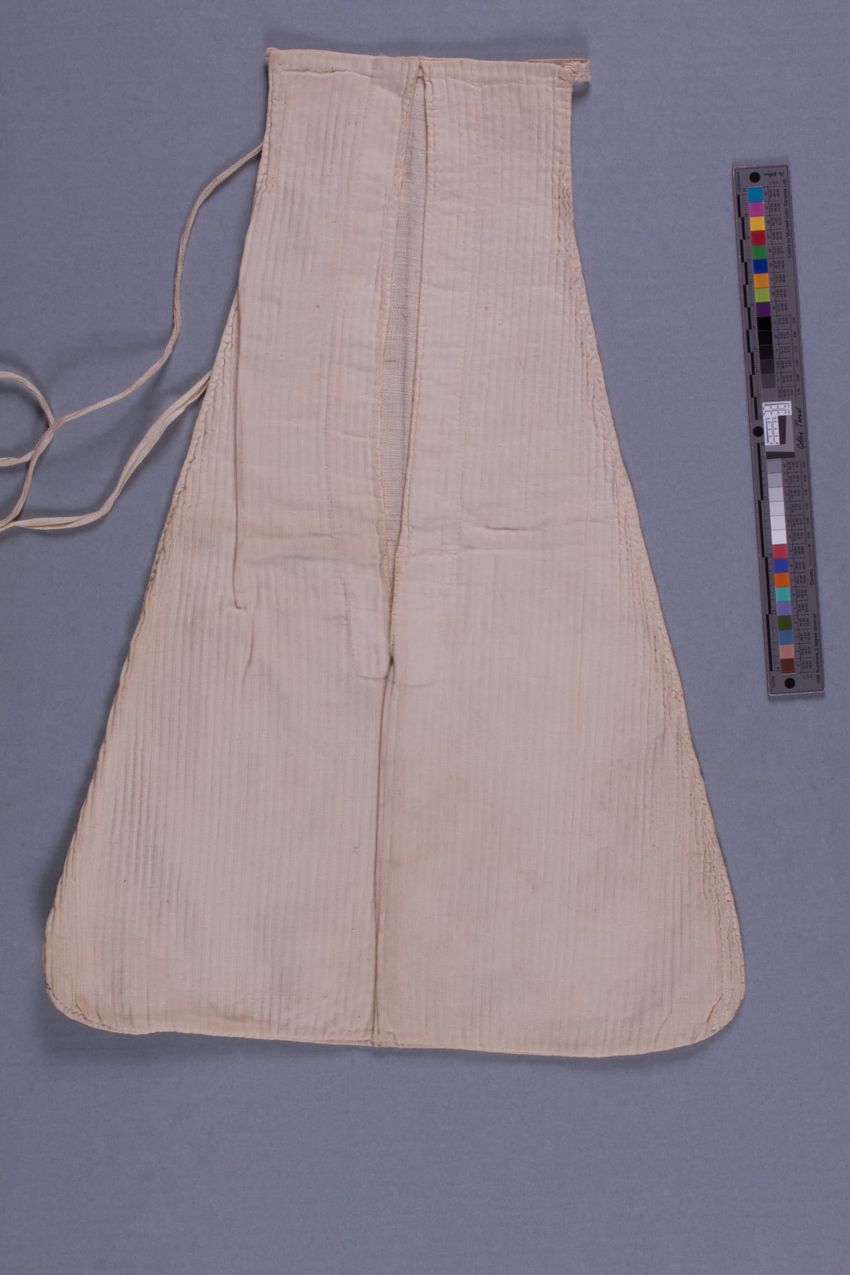 Flamestitch - horizontal bands of silk taffeta in blue, green, pink, browns, cream; pointed flap; edged with green tape; pink silk lining with two pockets; flannel piece - for needles?