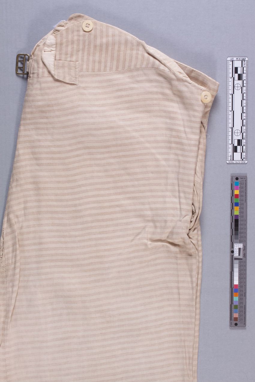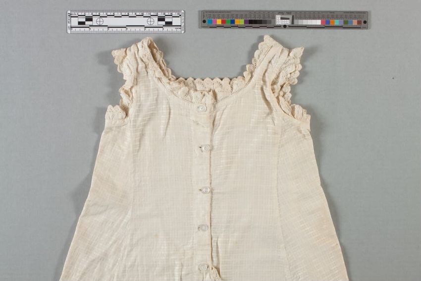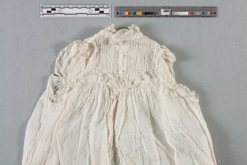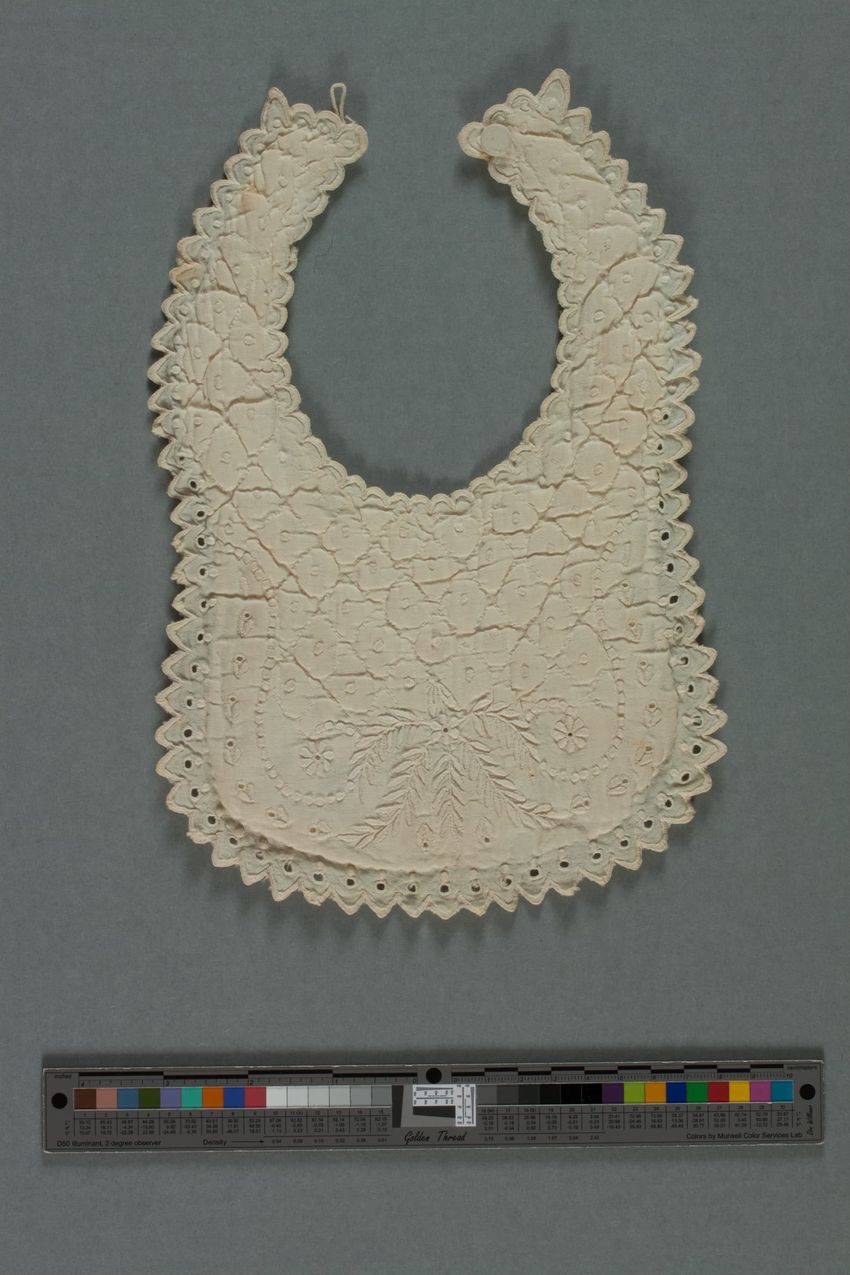 White embroidered with geometric pattern of French-knot flowers; drawstring neckline at front and back; Empire waist, fullness gathered in back at waist with double drawstring; short sleeves with finely hemmed, ruffled and one covered button. one tuck at hem, narrow ruffle, slight train, narrow wais...