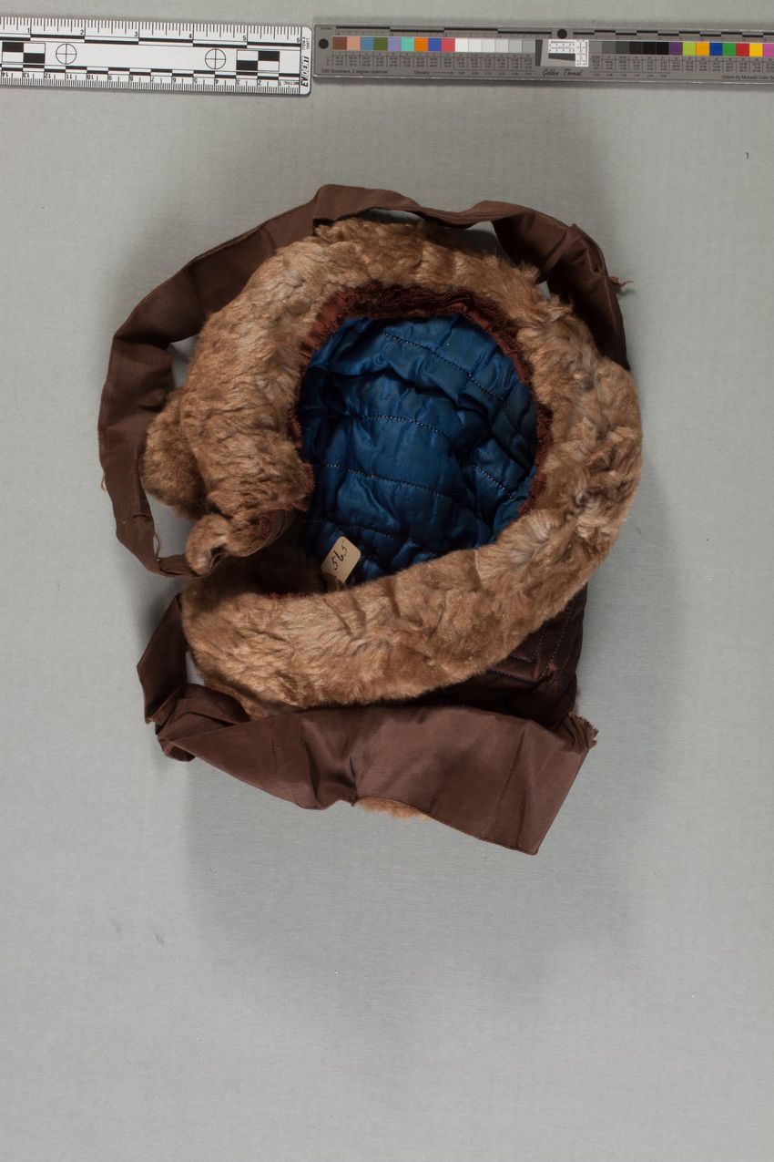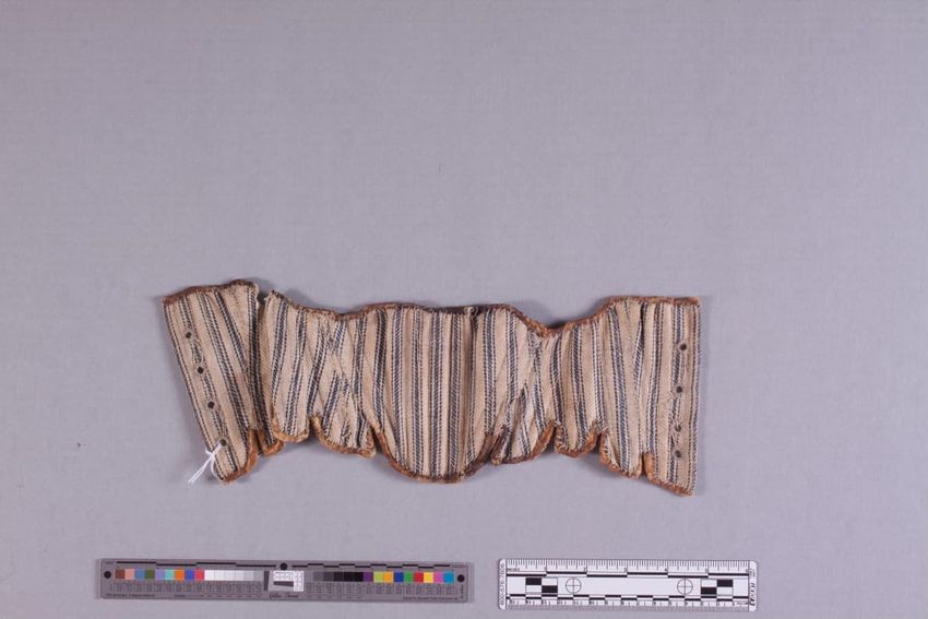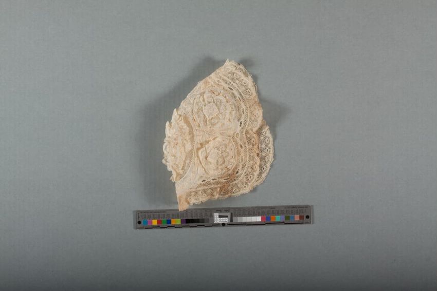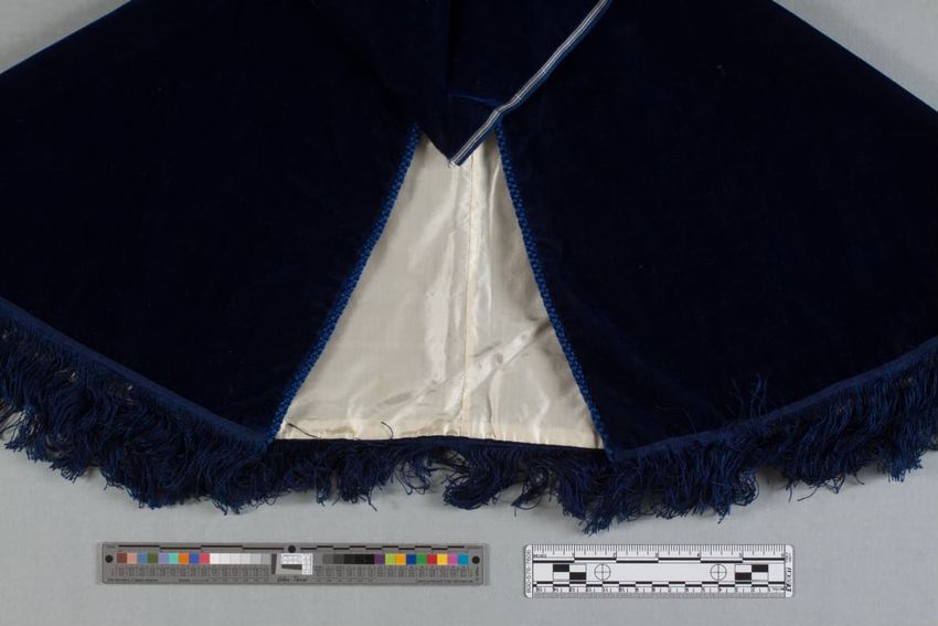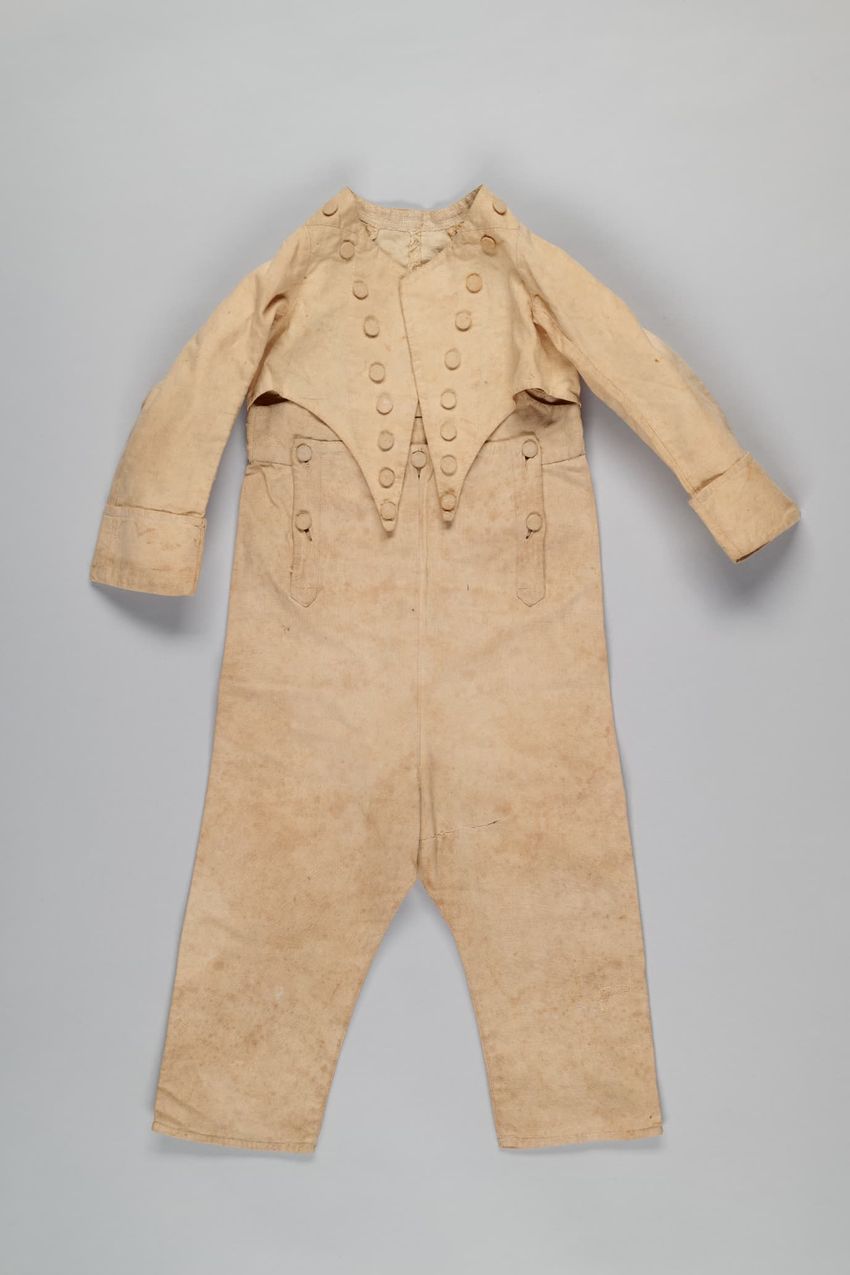 White embroidered with geometric pattern of French-knot flowers; drawstring neckline at front and back; Empire waist, fullness gathered in back at waist with double drawstring; short sleeves with finely hemmed, ruffled and one covered button. one tuck at hem, narrow ruffle, slight train, narrow wais...