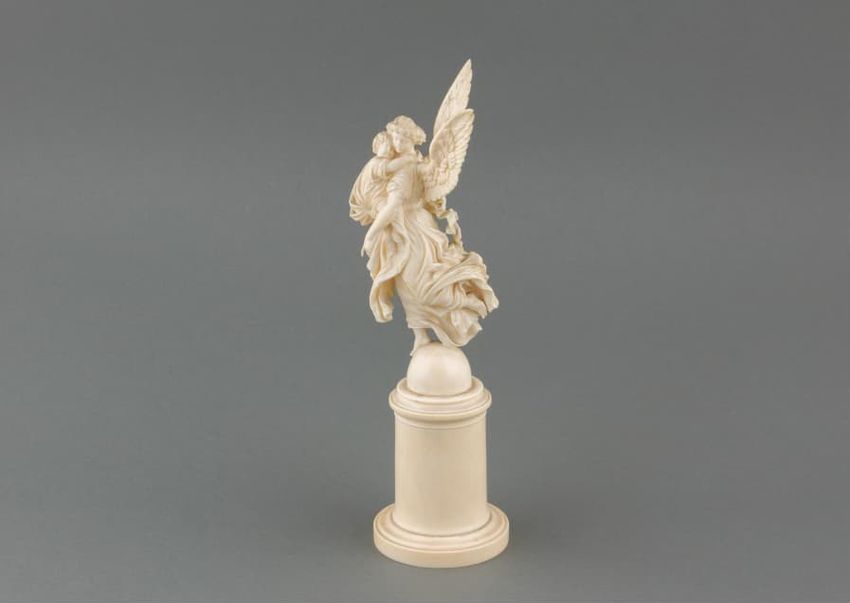 appliqué (technique), paint (coating), hand-painted, ivory (tooth component), paper (fiber product), sandalwood (wood), silk (textile)
