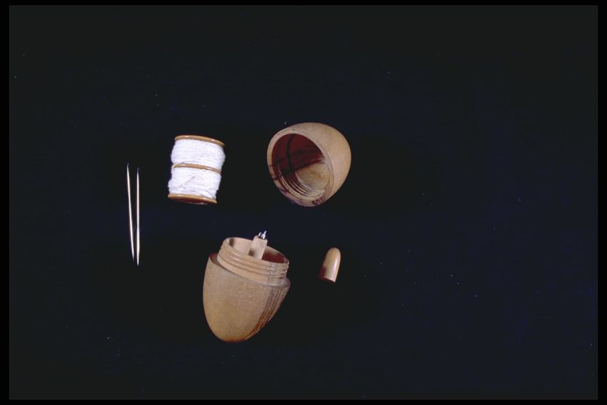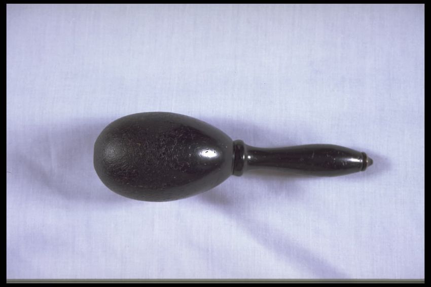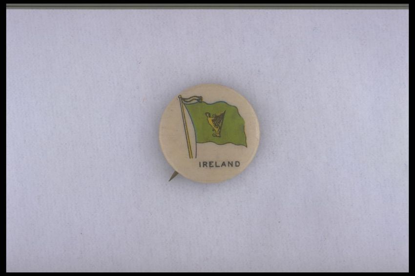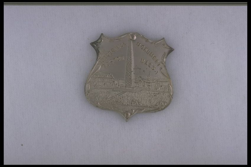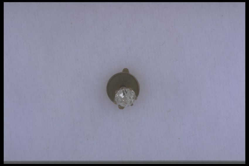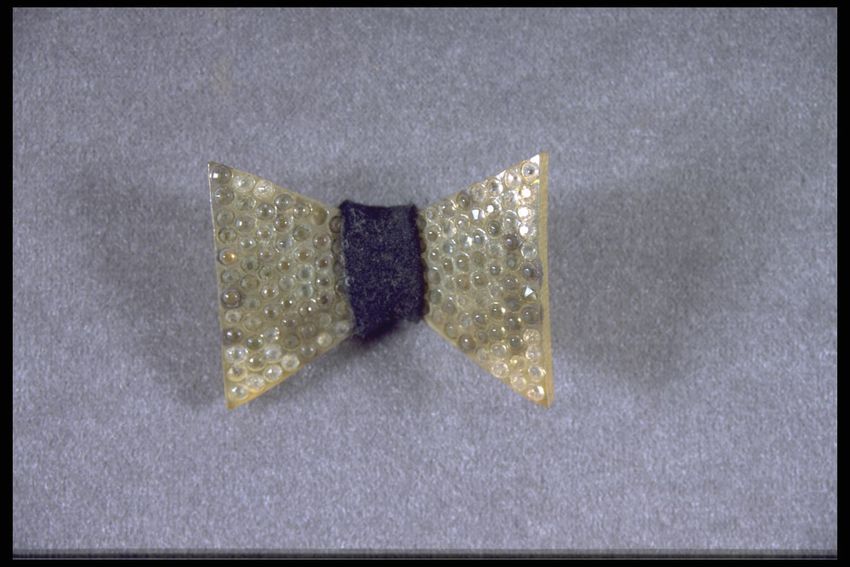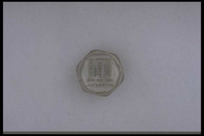 Metal cuff button embossed with three vertical columns on front. Each column bears one of the following inscriptions: "EFFICACY, UNIFORMITY, PURITY." A fourth, "RELIABILITY, " is arranged above the columns, horizontally; white metal w/ hexagonal shape.