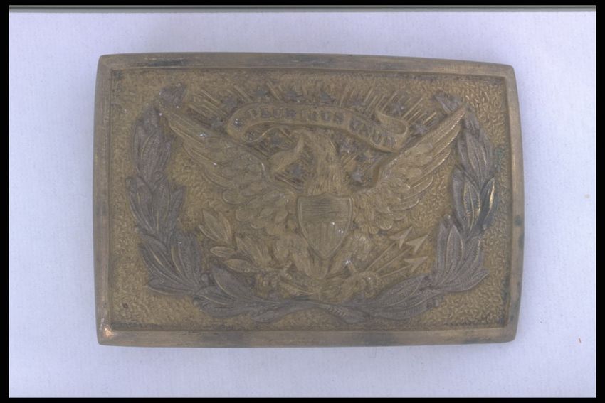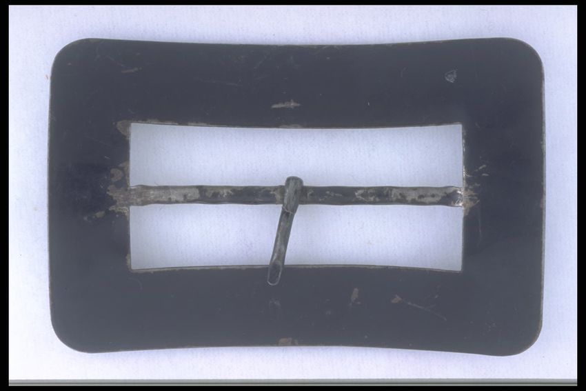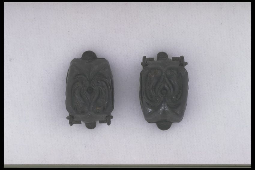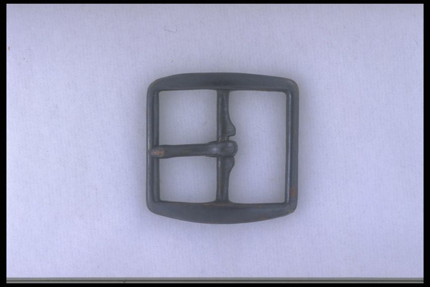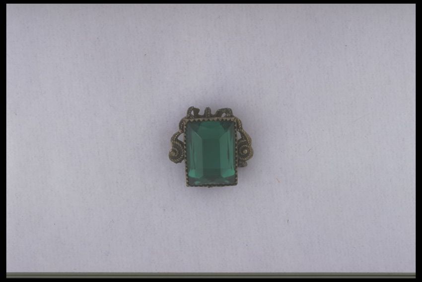 Belt constructed from eleven stamped, gold-colored, metal plaques connected with two rows of large metal links. Each plaque is square, decorated around the perimeter with a row of flowers. Center of each plaque is a stamped boss, set with a single green paste stone. The buckle is rectangular, elabor...