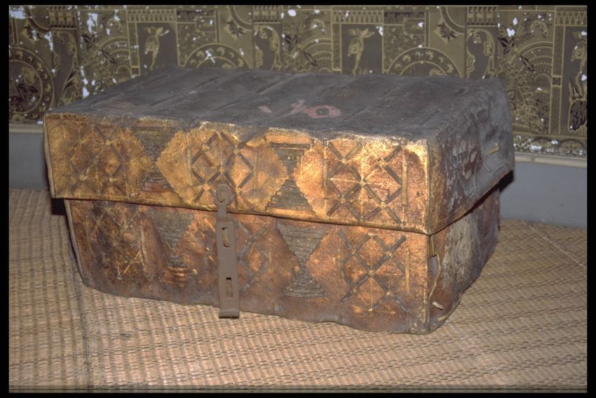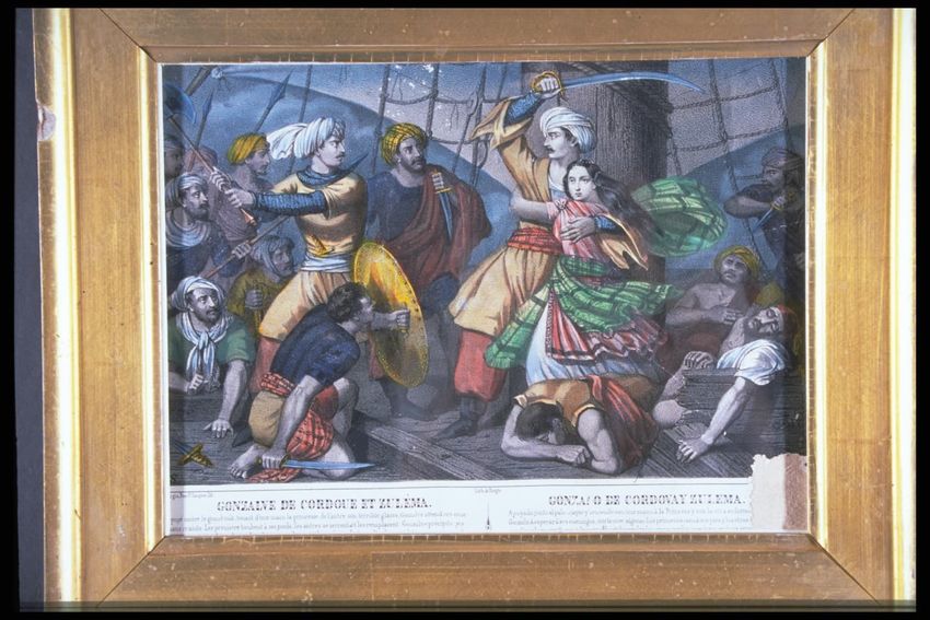 Ship battle scene of fifteen figures. The central figures include a male holding the female princess and defending her from at least four other males. A mast, ropes, knives, swords, and spears complete the image. Mounted in 2 inch gilt frame.