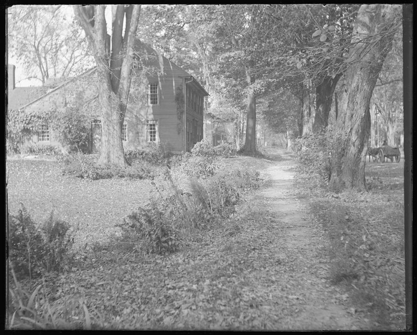 The image shows the exterior of a house in Deerfield, Massachusetts. The house is surrounded by trees and vegetation with a dirt path leading through the scene. In the background, a horse-drawn wagon is partially visible among the trees.