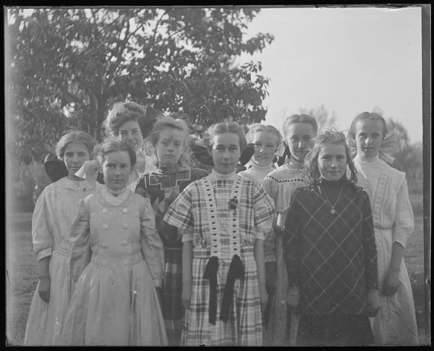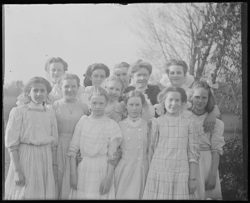 The image is a group portrait of young girls in East Douglas, Massachusetts. They are gathered closely together, with some girls wearing dresses with high collars and bows in their hair. Trees are visible in the background.