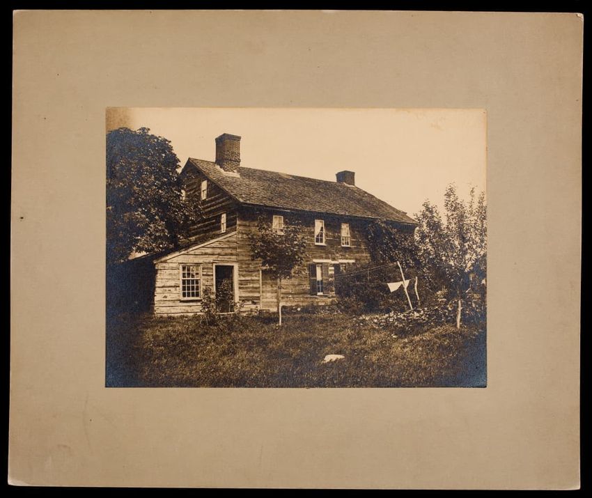 The verso description reads "House at West Boxford, Essex Co., Mass. 240 years old, been occupied by Pearl Family for 164 years. Used for a Garrison House, built with brick 10' high inside boards, has a brick compartment in one corner without windows, probably for refuge."