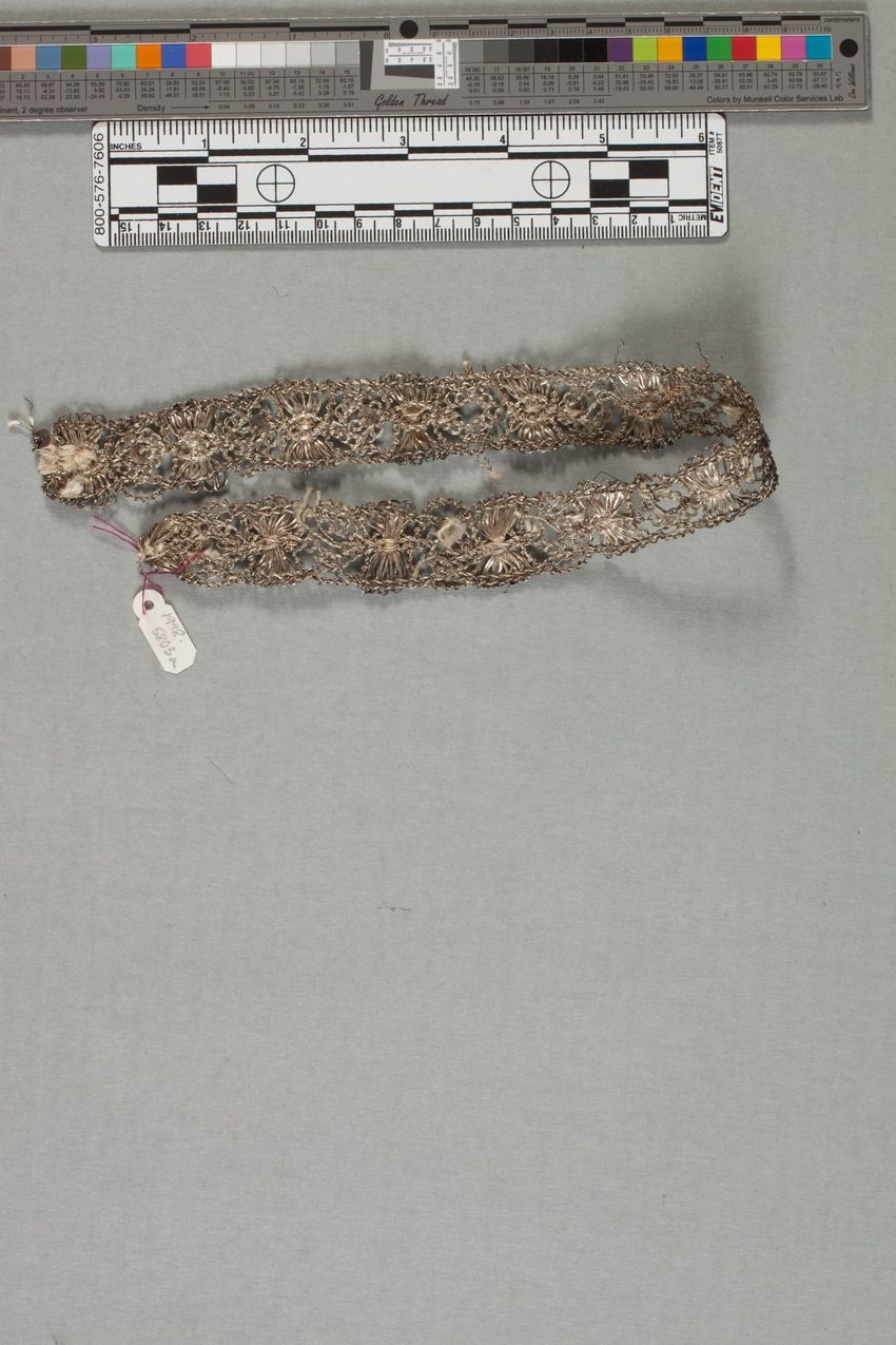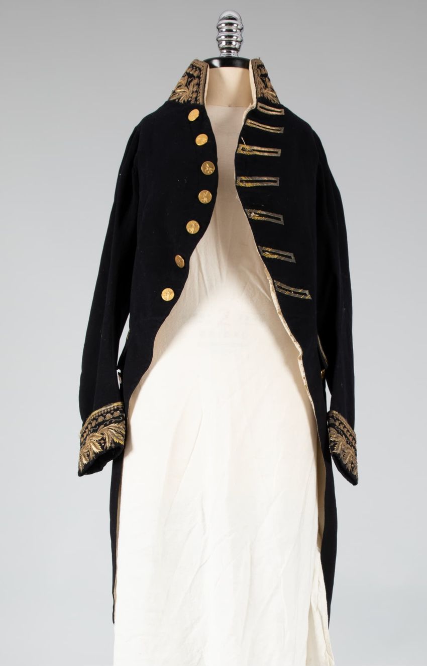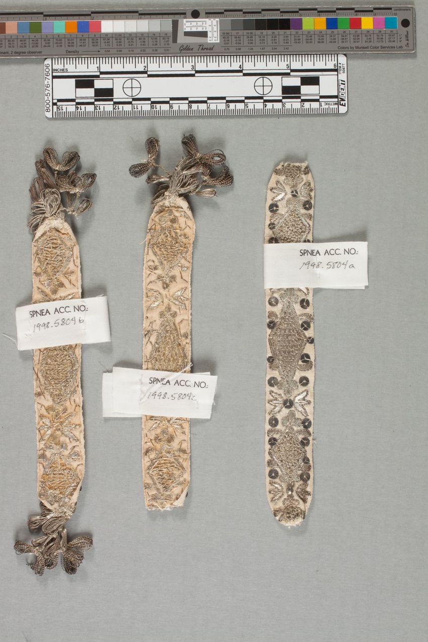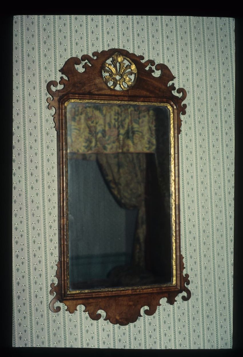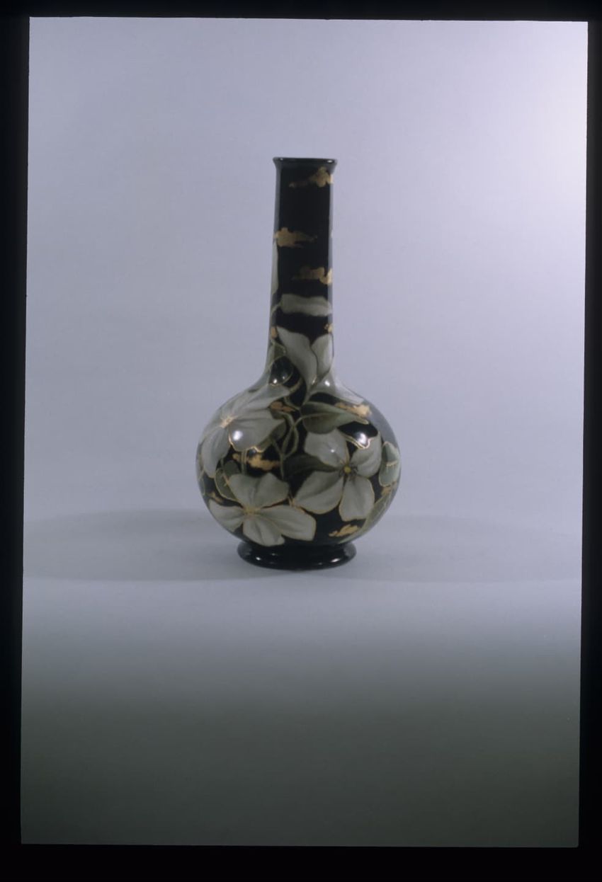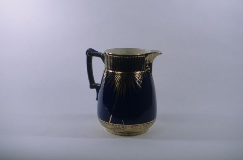 One teapot w/ lid. White porcelain w/ green and gold decoration. Scalloped rim, spout, lip and portion of C-shaped handle, trimmed w/ gold. Bottom section of pot is fluted, w/ a ground of light green overpainted(?) w/ gold (approx. 2" high). Main body of teapot is decorated w/ stylized palm trees on...