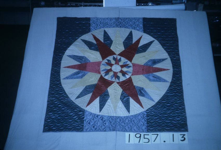 Central round border (diameter 56-1/2") and smaller circle (diameter 16-1/2") with mariner's compass within; points of red, blue, cream; circle ground white. Outside large circle body of quilt blue; quilted overall in "tea cup" pattern of interlocking circles.