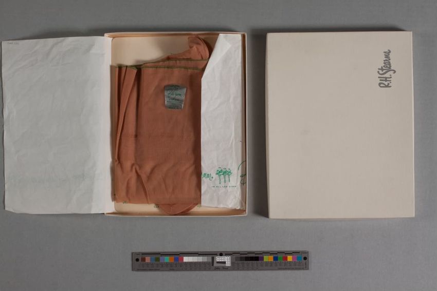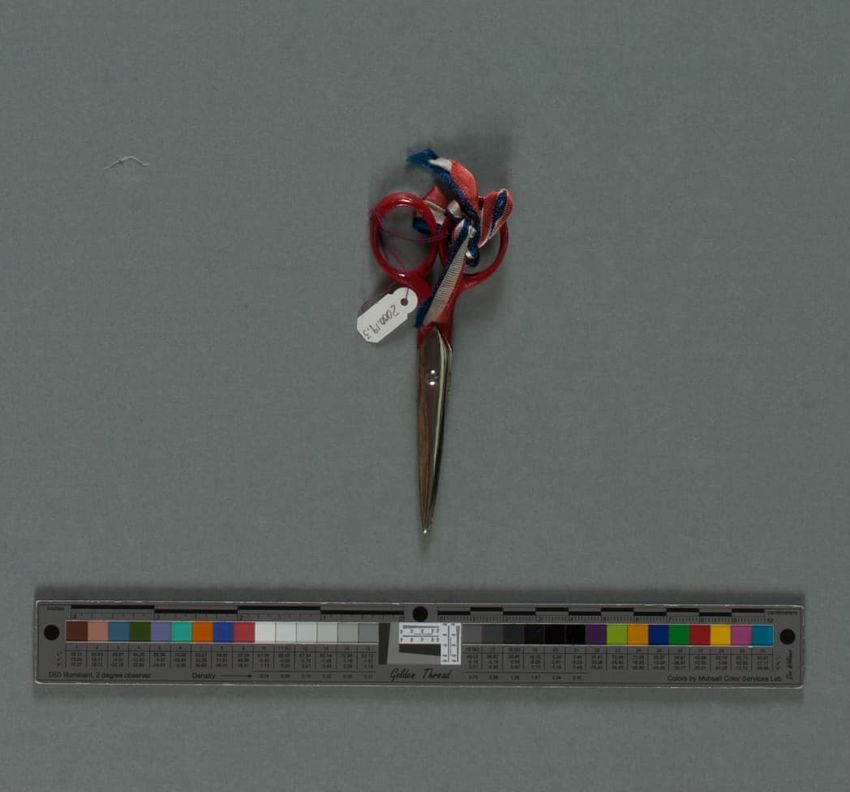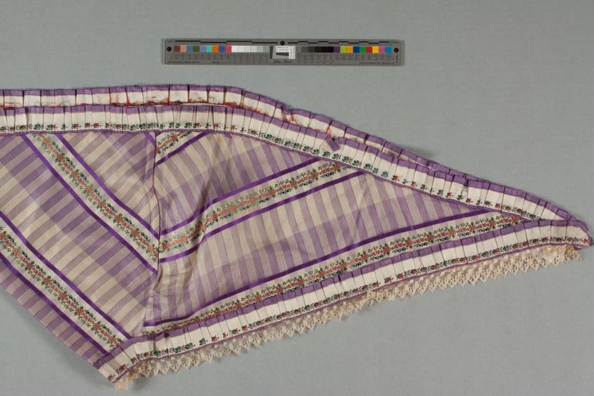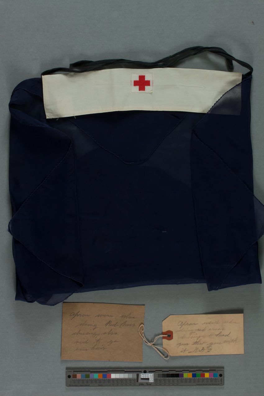 Machine sewn white cotton christening gown with machine made lace at collar, cuffs, empire waist, alternating across botton and scalloped along bottom edge. Three white buttons at back for closure--one missing. Gathered at empire waist. Three strips of lace coming down from neckline on front. Puffed...