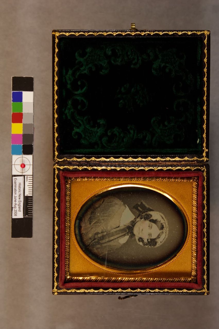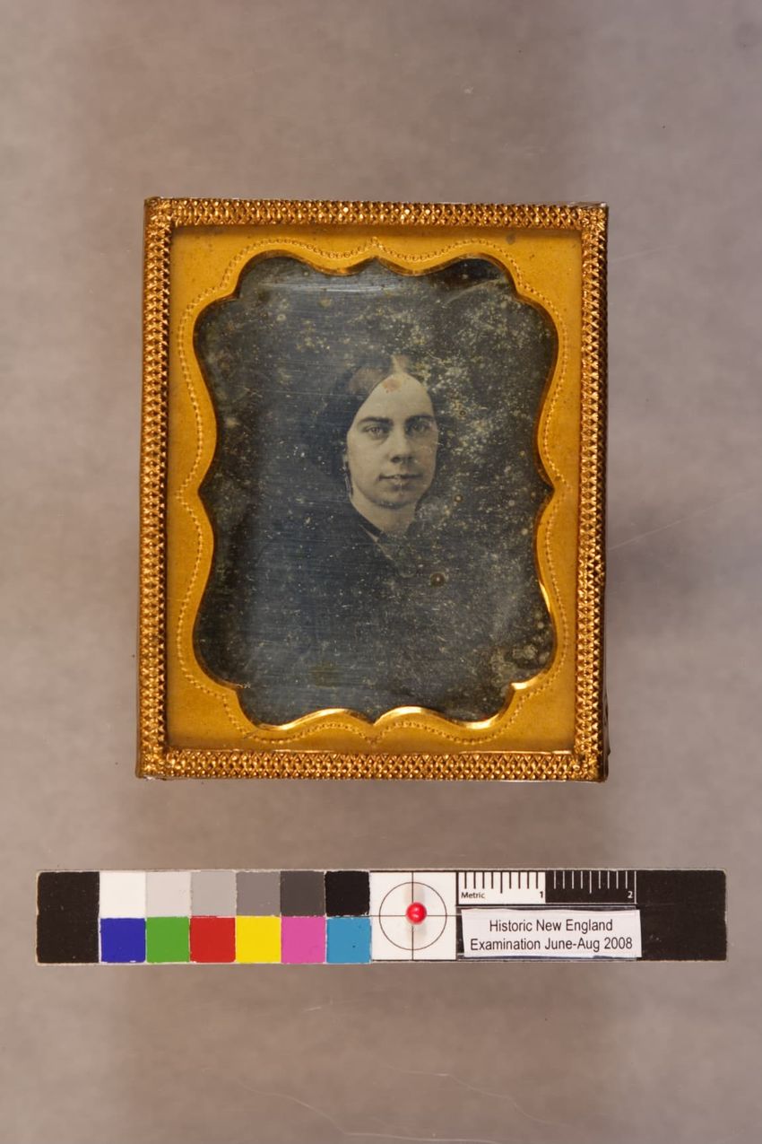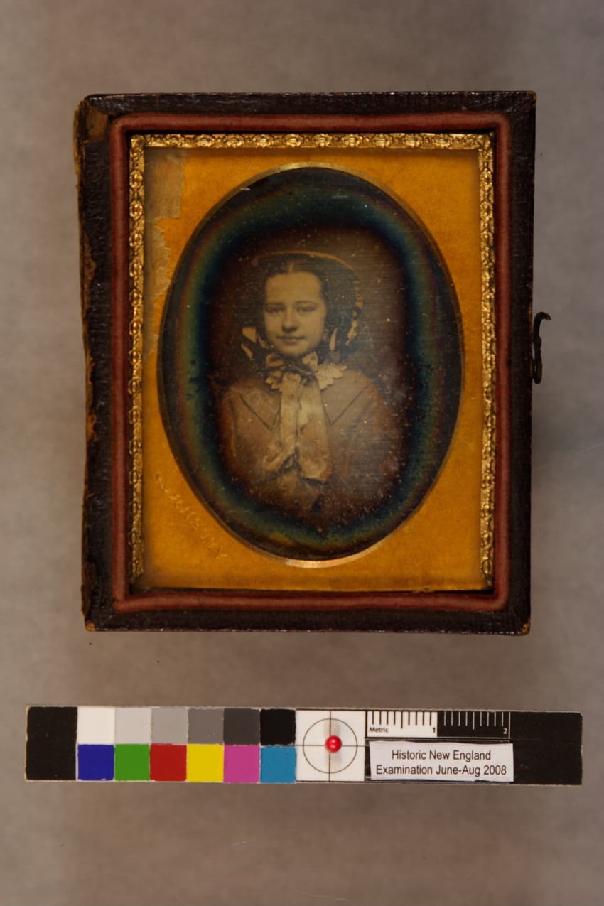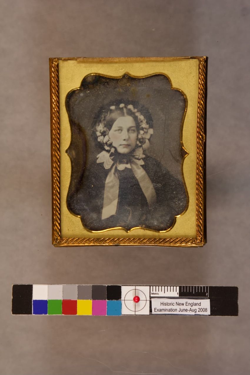 Young man with dark hair and a beard, wearing a striped tie, white shirt, and dark coat. The daguerreotype is housed in an elaborate wrought iron rose and shell scroll frame.
