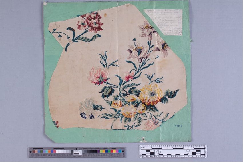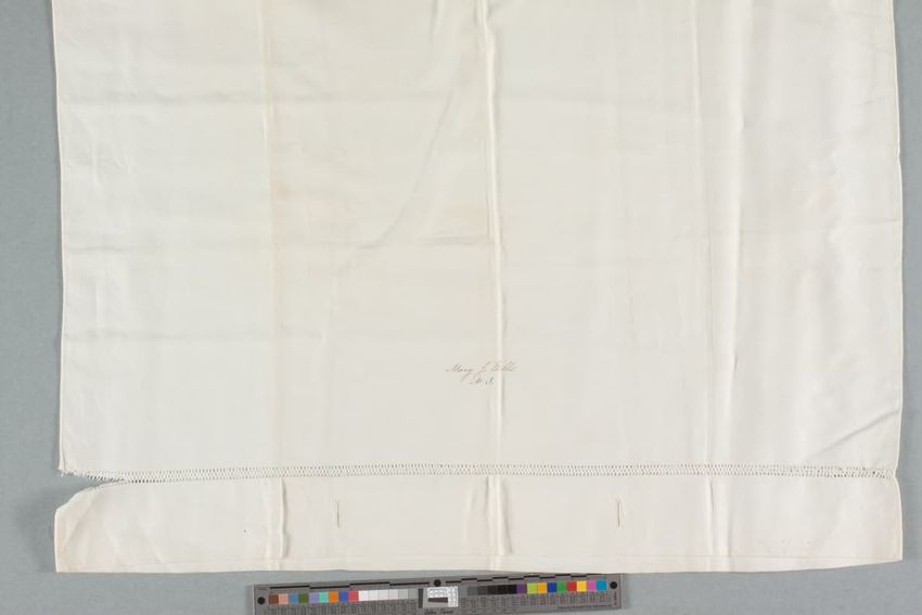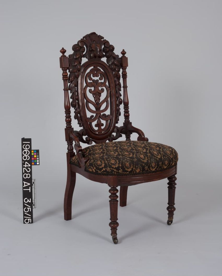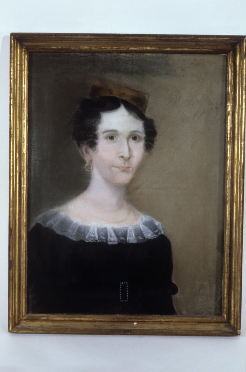 Bust-length portrait of a woman in a black dress with white lace collar facing right. Sitter has a rectangular tortoisehell haircomb in her hair and is wearing a square gold earring, three narrow gold chains, and a decorative belt buckle. Twin sister, Mary Sparrow, is 1966.460.
