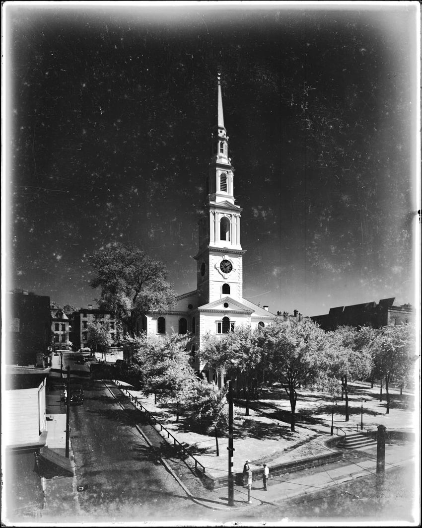 T.H. Dyer + Co., tall brick church, discoloration on left side, horse + buggy, and another church.