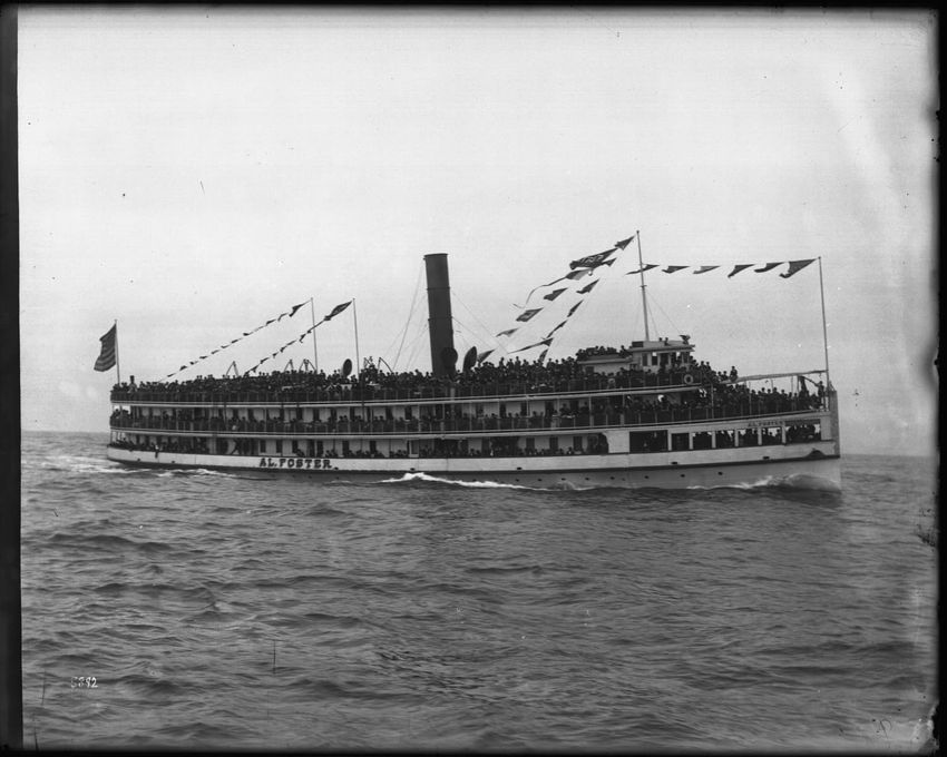 Shacks' along the beach pergola, small 'fancy' boat house, two long piers, standpipe, homes.