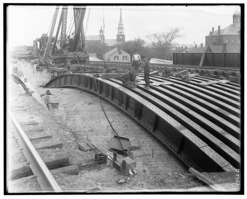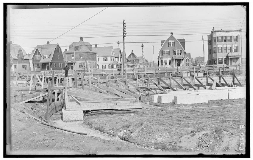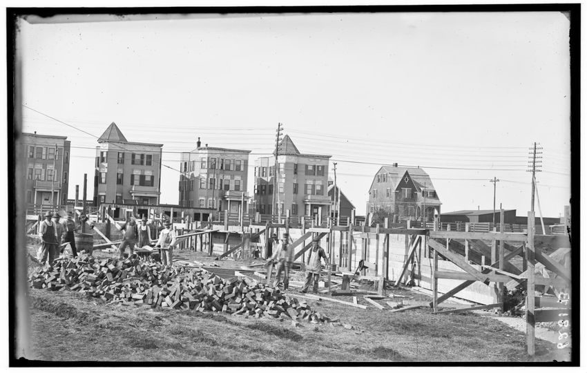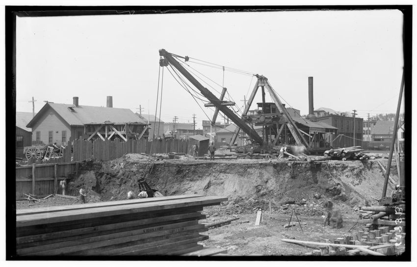 The image depicts a construction site at Huntington Avenue Yard, Boston, Massachusetts. In the scene, there's a large crane with cables and pulleys positioned above an excavation area. Workers are visible in the pit and nearby, and various construction materials, such as wood planks and beams, are s...