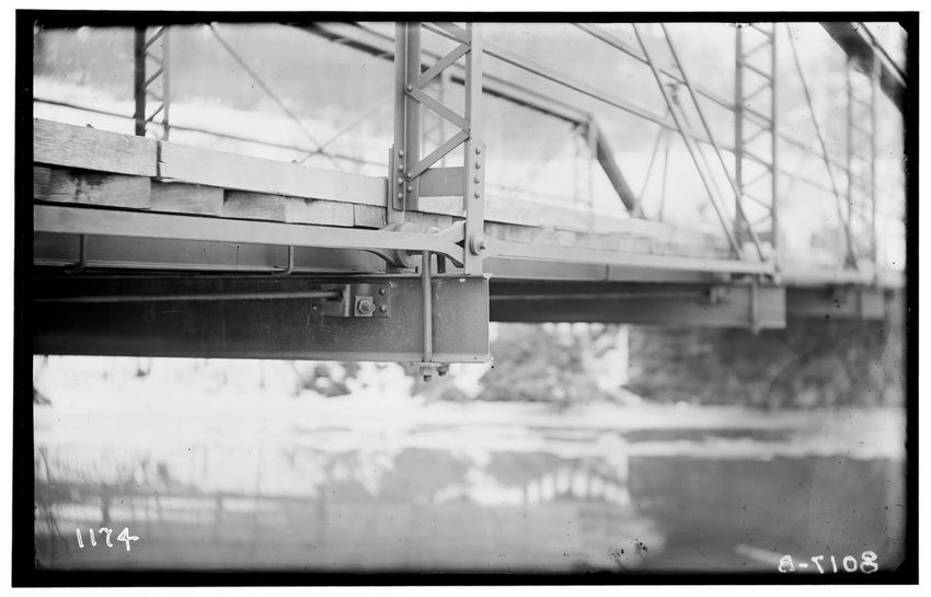 The image shows a close-up view of Percy's Crossing River Bridge in Chatham, New York. The focus is on the metal structure and support beams of the bridge, with a portion of the river visible beneath. The lattice design of the metalwork is apparent, along with the bolts and joints connecting the com...