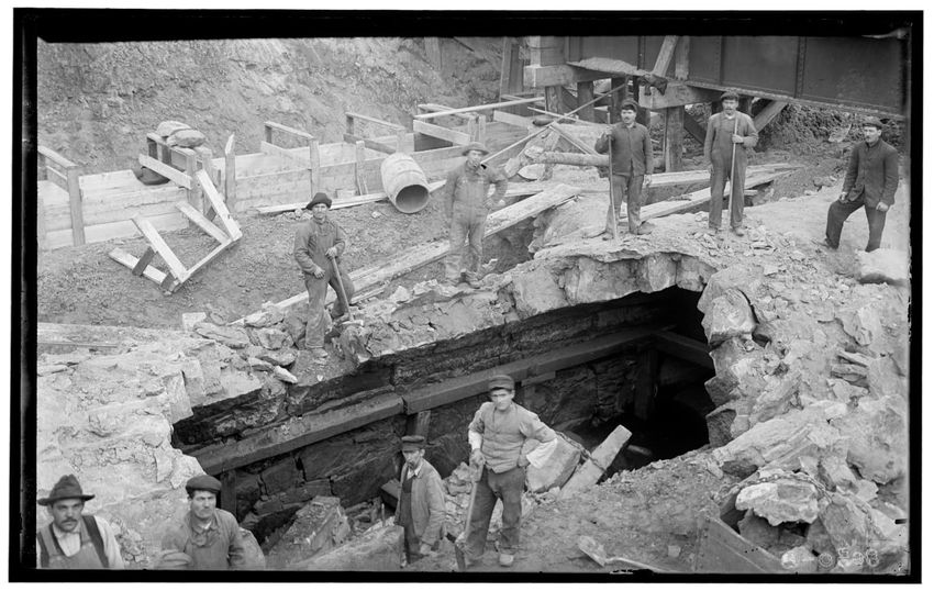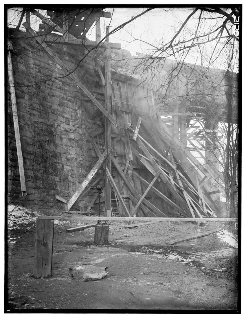 The image shows a group of workers engaged in the process of tearing out an old arch as part of bridge reconstruction activities in Natick, Massachusetts. Several men are holding tools and standing around the partially demolished bridge arch. The construction site features wooden supports, scattered...