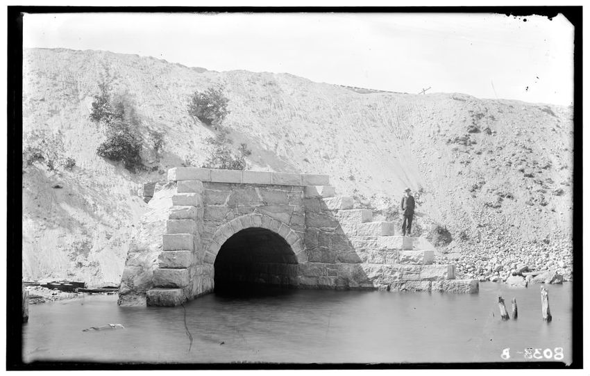 The image depicts an arch culvert located at the 16th mile post in Wellesley, Massachusetts. It shows a stone structure with a curved arch, partially submerged in water. A person is standing on the stonework to the right of the arch. The surrounding area features sloped, sandy terrain with some vege...