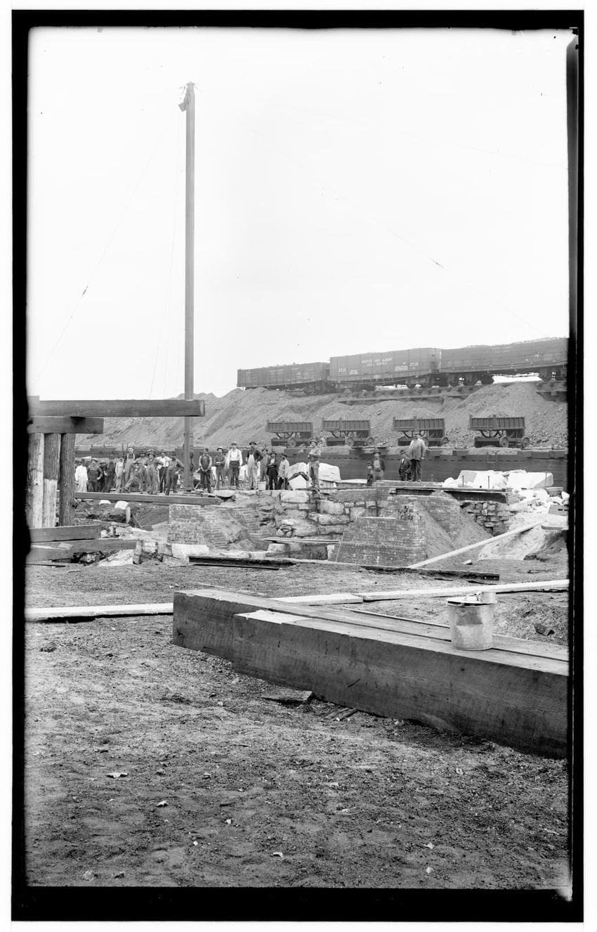 The image shows the construction site of a coaling plant in North Greenbush, New York, viewed looking west. Several workers are visible, positioned near a foundation structure. In the background, rail cars are on elevated tracks, and piles of dirt are present. A tall pole is seen rising from the gro...