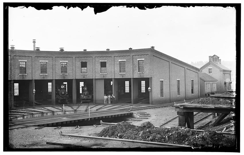 The image shows the exterior of an engine house in Worcester, Massachusetts. The building is constructed of brick and features multiple windows. Three locomotives are visible inside the open bays. Several individuals are standing near one of the locomotives, and tracks lead into the building, which ...
