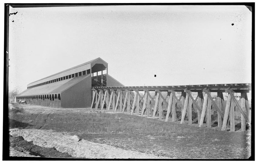 The image depicts a large coal shed structure in Allston, Boston, Massachusetts. The shed features a long, steeply sloped roof and a framework with numerous supports. A horse is visible on the left side of the shed, pulling a cart.