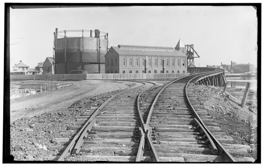 The image shows a railroad trestle curving towards a gas works facility in Allston, Boston, Massachusetts. Prominent in the scene is a large gas storage tank and an adjacent brick building with multiple windows. The trestle runs alongside a body of water and additional industrial buildings are visib...