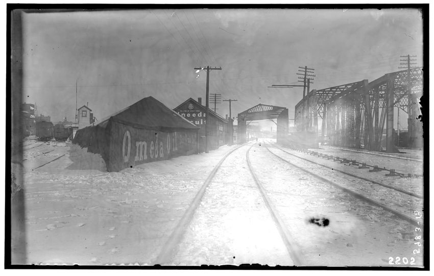 The image shows a railway line along the Highland Branch with tracks leading under a metal bridge structure. There are several industrial buildings alongside the tracks, with visible signage including "Uneeda Biscuit" and "Omega Oil." Utility poles and wires are also running alongside the tracks.