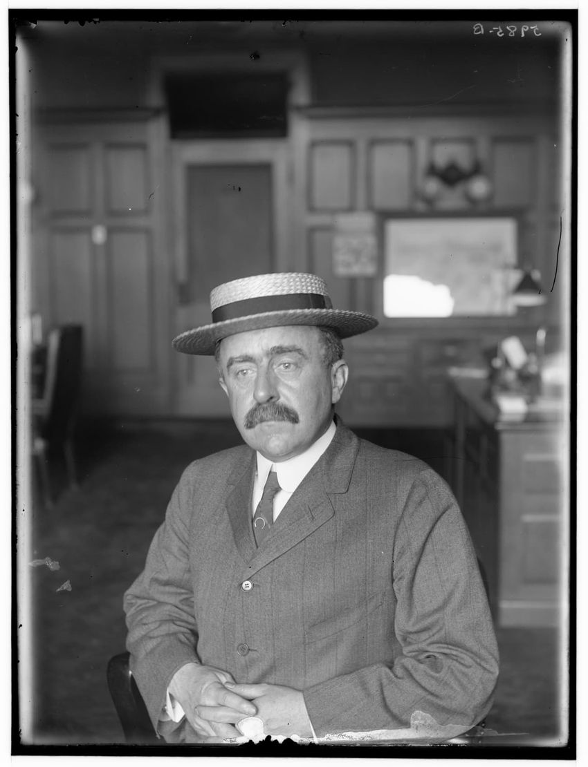 The image shows a portrait of James H. Hustis, the Vice President of the B&A Railroad. He is wearing a suit and a straw boater hat, sitting with his hands clasped, in an office setting with wooden paneling and a desk in the background.