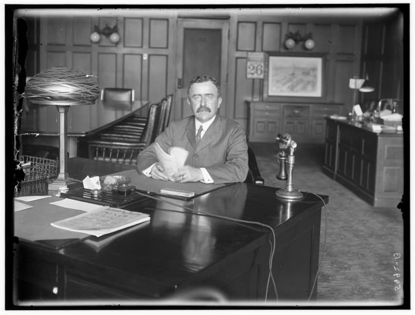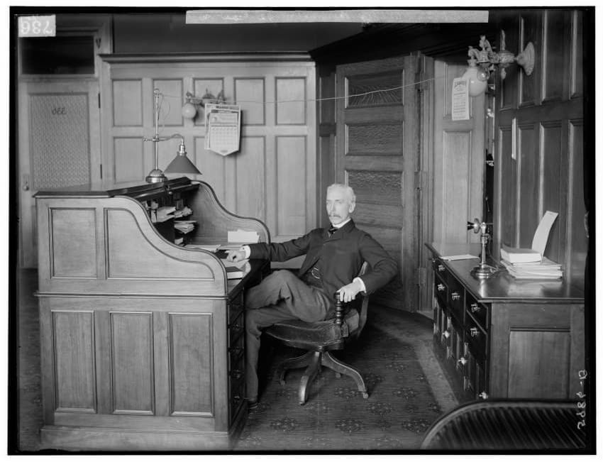 The image features Mr. James H. Hustis, Vice President of Boston and Albany Railroad, seated at a large wooden desk in an office setting. He is holding some documents and a vintage telephone, a lamp, and various papers are visible on the desk. The background includes wood-paneled walls, additional o...