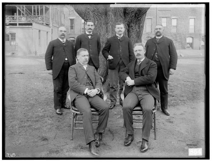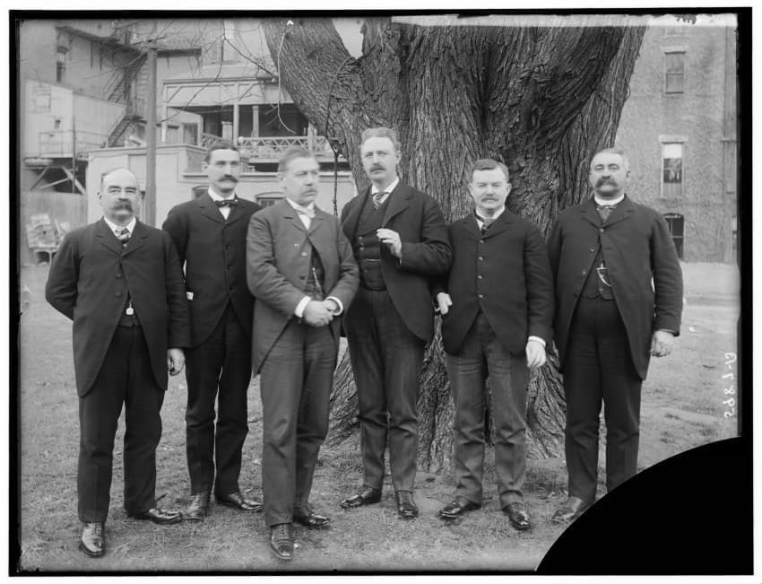 The image shows a group of six men dressed in formal suits, standing in front of a large tree. These men are identified as officers of the Boston and Albany Railroad. In the background, there are buildings with visible windows and architectural details.