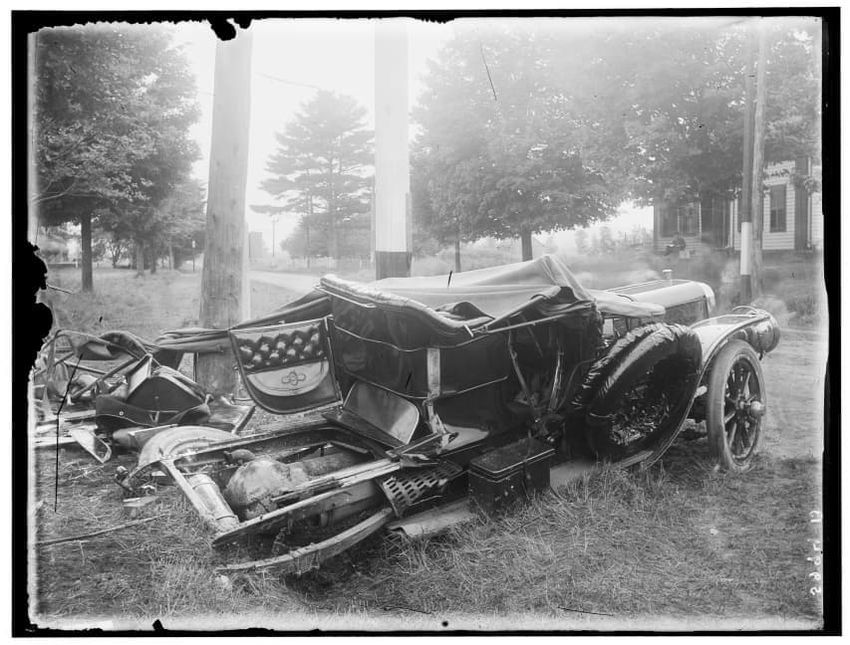 The image shows the aftermath of a crossing accident involving an automobile in East Brookfield, Brookfield, Massachusetts. The vehicle appears severely damaged, with visible distortion of the body and wheels. It is situated near a few large utility poles and trees, with a house visible in the backg...