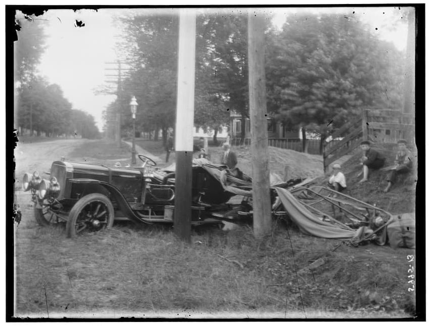 The image shows the aftermath of an automobile accident in East Brookfield, Brookfield, Massachusetts. The scene features a damaged car that has collided with a utility pole. Several people are present, some standing near the accident site and others sitting on the sloped ground nearby. Trees and a ...