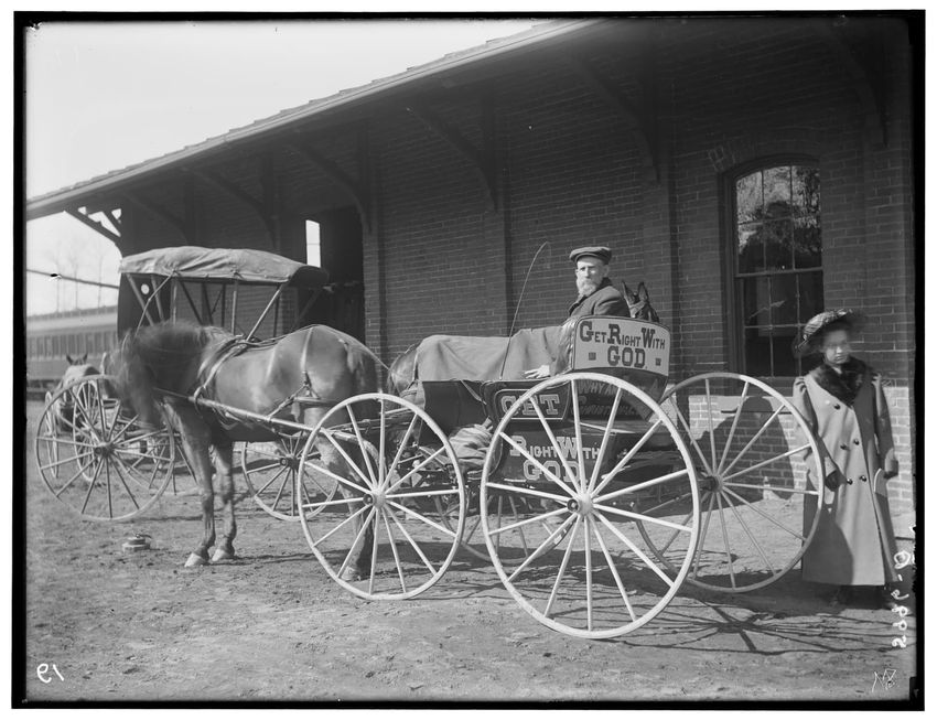 The image shows a man seated in a horse-drawn carriage in front of a brick railroad station in Templeton, Massachusetts. The carriage is adorned with signage urging viewers to "Get Right With God." A woman is standing beside the carriage and there are additional horse-drawn carriages visible in the ...