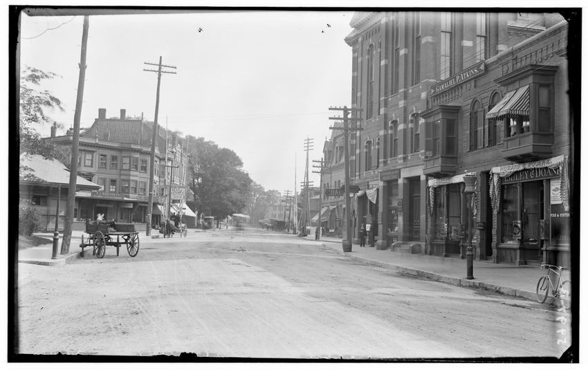 The image depicts a view of a street at the railroad crossing in Newton Corner, Newton, Massachusetts. The scene includes a dirt street lined with buildings on both sides, featuring various storefronts with awnings and signage. Visible are telegraph poles, horse-drawn carriages, a bicycle, and pedes...