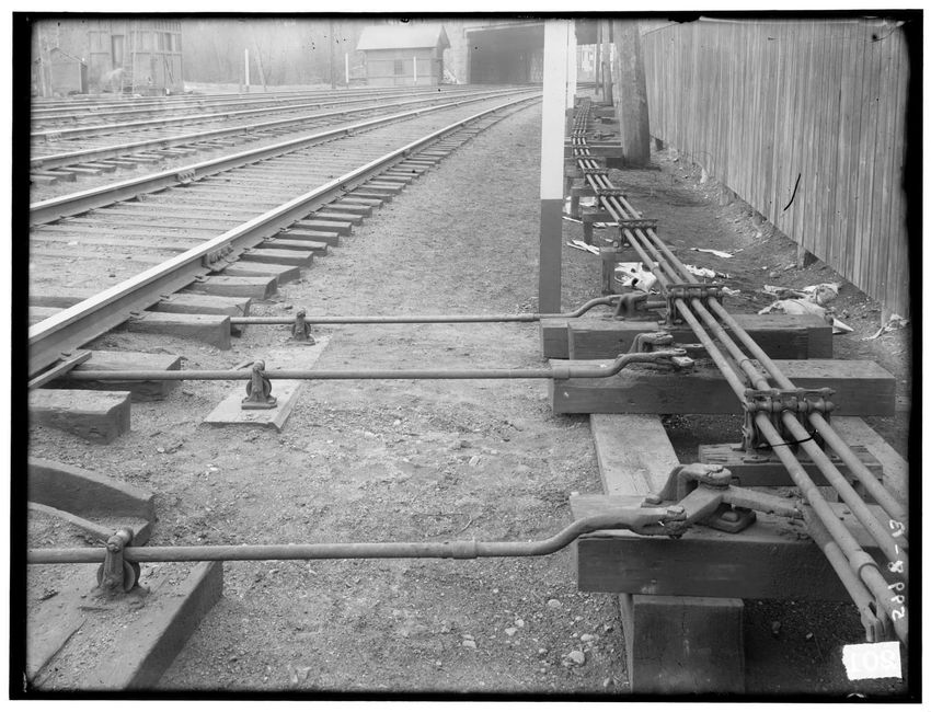 Detail showing switch control rods leading to the switch house in a tower, 5998-B