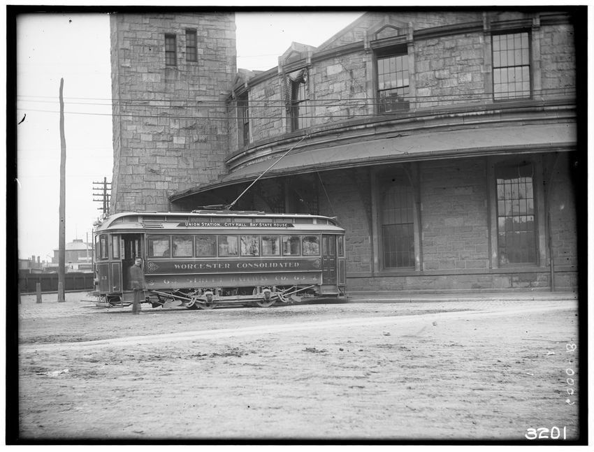 The image shows a trolley car at the old Union Station in Worcester, Massachusetts. The trolley car is labeled "Worcester Consolidated" and has signage indicating destinations including Union Station, City Hall, and Bay State House. A person is standing next to the trolley car.