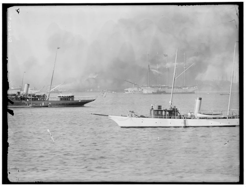 The image depicts the aftermath of a fire at a pier in East Boston, Massachusetts. Several boats are visible on the water in the foreground, including one flying a flag. In the background, smoke rises from the pier area, offering a view of the impact of the fire. A large, multi-masted sailing ship i...