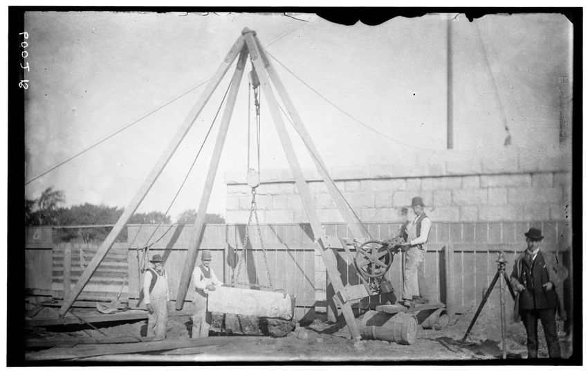 Tripod used in construction of Everett Street pier, Boston, Massachusetts, 6002-B